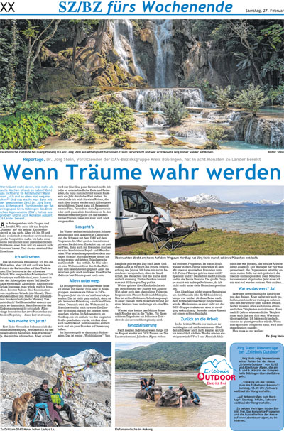 Unser Bezirksgruppenleiter Jörg Stein hat im letzten Jahr eine achtmonatige Auszeit genommen und 26 Länder bereist. Die SZ/BZ berichtet am 27.2. darüber und auf der Outdoor-Messe am 5./6. März in der Kongresshalle Böblingen finden zwei Vorträge dazu statt: