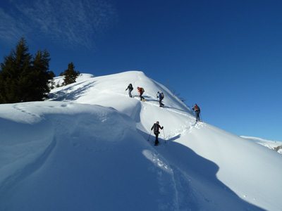 Zu Fuß durch verschneite Landschaften. Im Grundkurs erlernst du alle Fähigkeiten, um selbständig einfache bis mittelschwere Schneeschuhtouren durchführen zu können. Neben Gehtechniken für schwieriges Gelände werden euch Kenntnisse zu Lawinen-, Ausrüstungs- und Wetterkunde vermittelt.